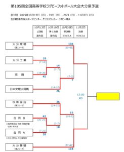 第105回全国高校ラグビー大会県予選準決勝 2025.09.292025.10.26 イベント詳細 日付: 2025年10月26日 会場: 大分スポーツ公園サッカー・ラグビー場Aコート カテゴリ: 高校 第105回全国高校ラグビー大会県予選 ◎準決勝 ・11:00 大分東明 vs 2回戦勝者 ・12:30 2回戦勝者 vs 大分舞鶴