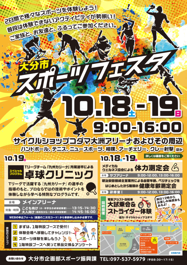 [タグ]大分市スポーツフェスタ:誰でも参加できるスポーツ体験イベントです。10/18はタグラグビー体験コーナーに是非お集り下さい。