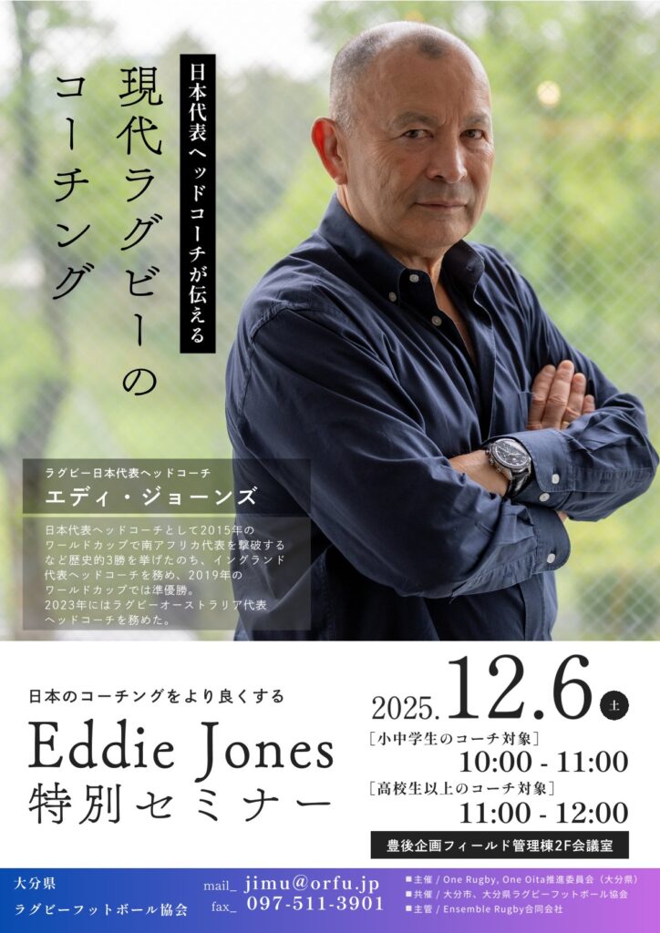 大分市にて、ラグビー日本代表ヘッドコーチ エディ・ジョーンズ氏 を講師に迎えたコーチングセミナーを開催いたします。 本セミナーは、未来のラグビーを担う子どもたちの育成に携わる指導者の皆様に向けて、実践的かつ有意義な学びの場となることを目的としています。